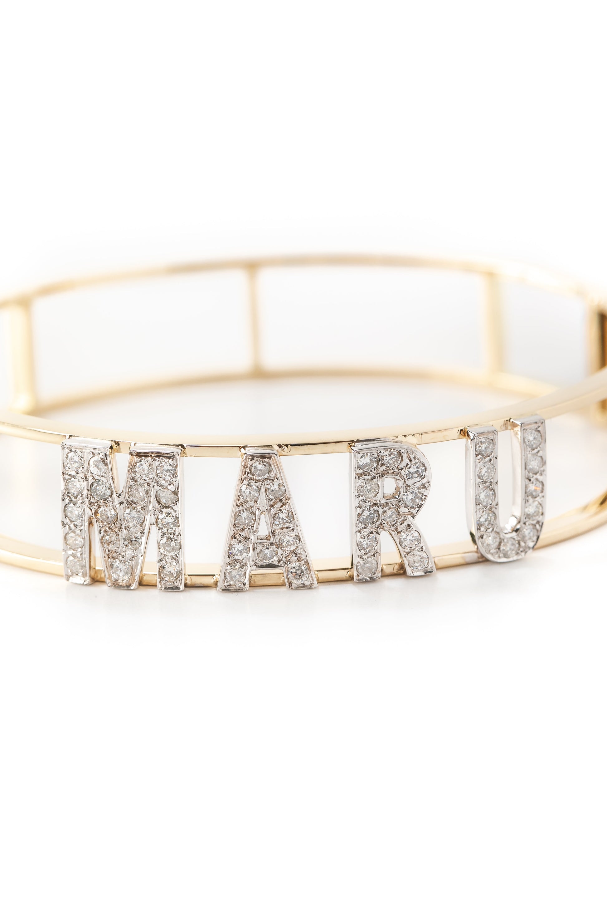 Pulsera de letras en oro amarillo de 14K con diamantes de 1.5mm y un ancho de 1.4cm