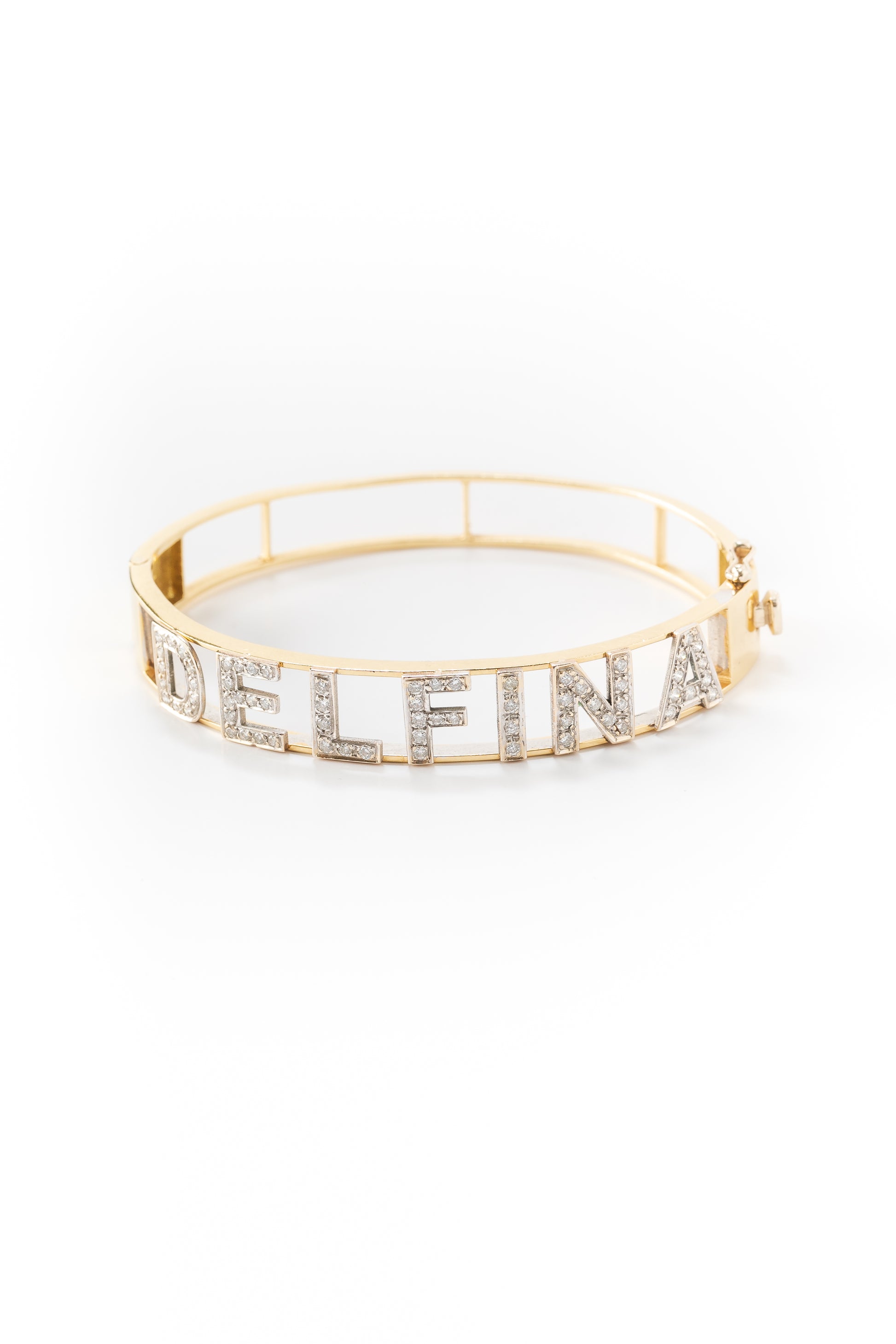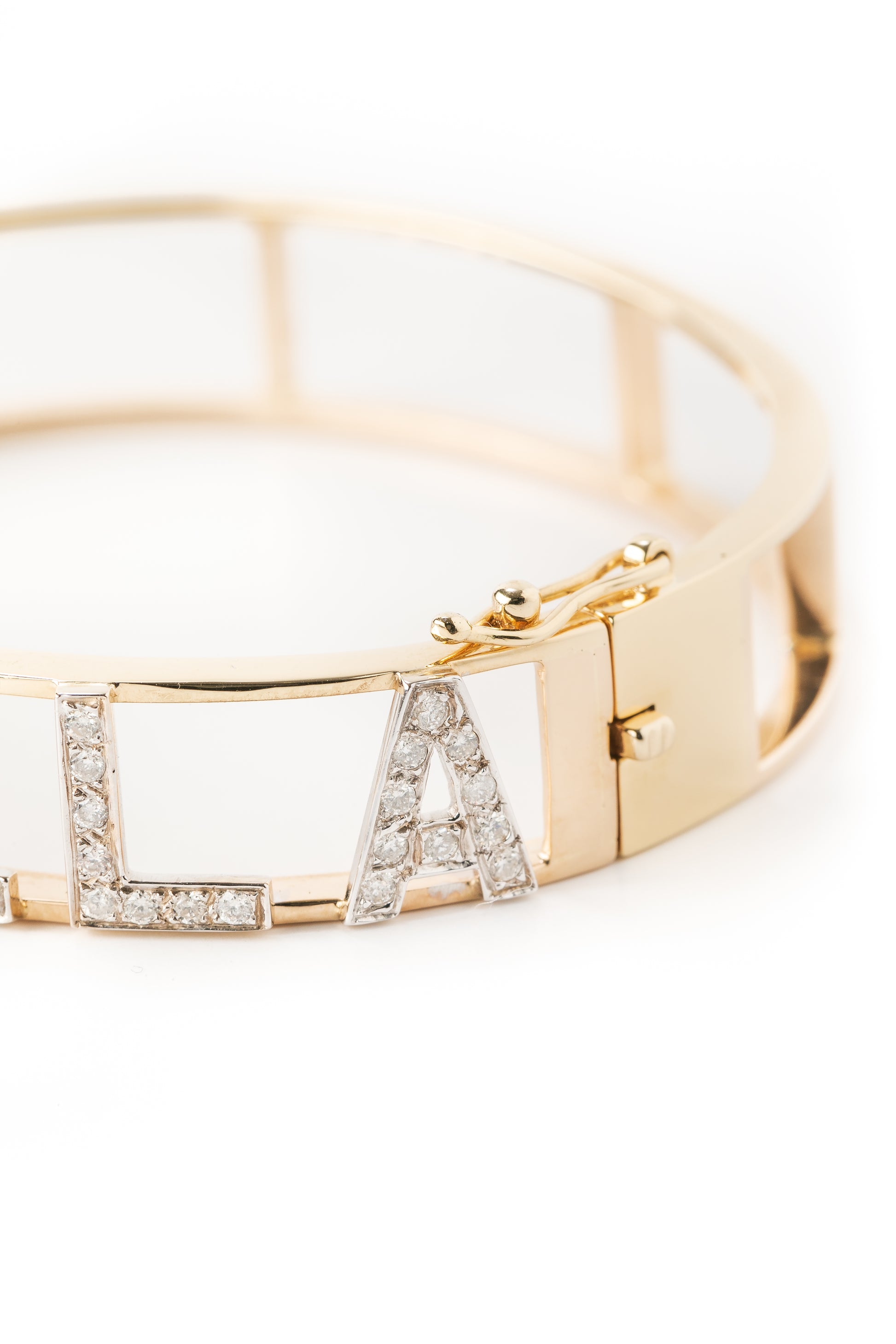 Pulsera de letras en oro amarillo de 14K con diamantes de 1mm y un ancho de .7cm